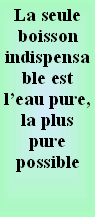 La seule boisson indispensable est l'eau pure, la plus pure possible. Les autres nutriments dont l'organisme à besoin, y compris les sels minéraux, doivent être fournis par la nourriture. Un certain temps après leur mise en bouteille, les eaux minérales deviennent des eaux mortes, moins favorable à la santé, surtout si elles sont en bouteilles plastique. Il faut toujours choisir des eaux minérales le moins chargées en sels. Des expériences ont montré que les minéraux contenus dans ces eaux n'étaient pas assimilables par l'organisme. Les minéraux sont mieux assimilés lorsqu'ils sont sous forme organique, en particulier sous forme végétale. Les eaux du robinet, chargées en nitrates et chlorées, détériorent la qualité alimentaire des légumes. Quant au calcaire, au tartre, il n'est guère recommandé dans l'eau de cuisson et il abîme certains ustensiles de cuisine. On trouve dans ces eaux des composés minéraux employés pour l'assainir en tuant les germes vivants dans les tuyauteries, tels l'hypochlorite (eau de javel), le chlore que dégage sa décomposition, et de l'ozone. Ces substances fortement oxydantes nuisent à nos cellules dont elles accélèrent le vieillissement. Une eau de boisson saine doit être neutre ou très légèrement acide : son pH doit être compris entre 6,8 et 7. S'il est supérieur à 7, l'eau est basique, ce qui est défavorable à la santé.
